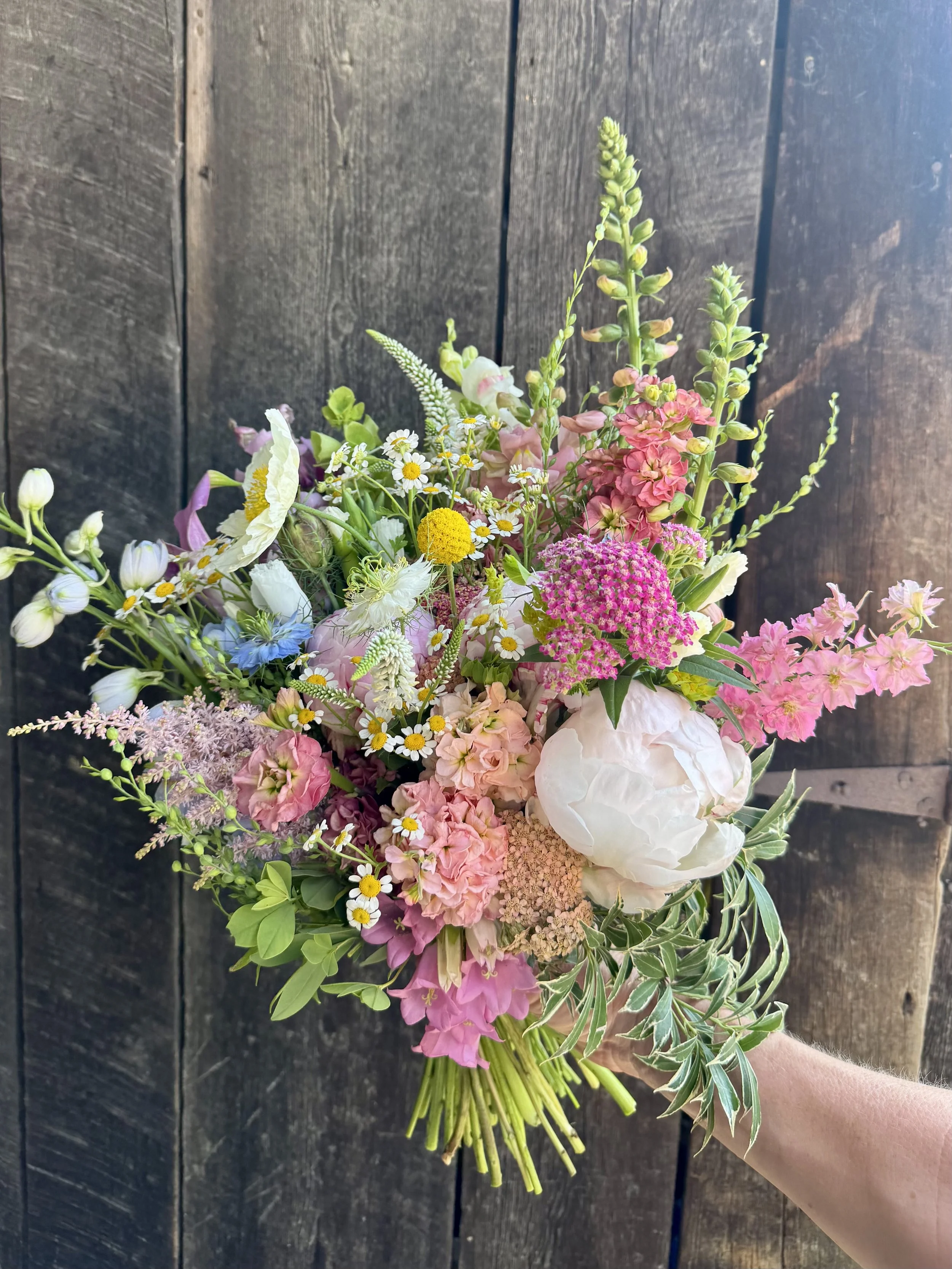 Choose between four beautiful color palettes: Classic Whites & Greens, Soft Neutrals, Bright & Colorful and Autumn Hues. We use the best of what is blooming at the time of your wedding using flowers fresh from our farm or a local farm nearby that we know and trust. This service is only available between April 1 - October 15. We grow so many beautiful flowers on our farm and you can learn a little more about what you may receive at the time of your event here. Because these designs are “designer’s choice” within your selected color palette option, we are not able to accommodate special floral or color palette requests.